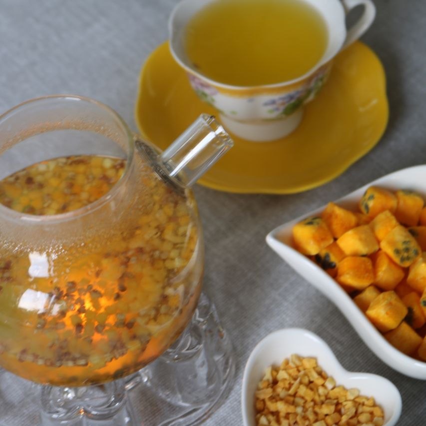 Яркий, сочный купаж на основе гречишного чая, кусочков маракуйи и манго